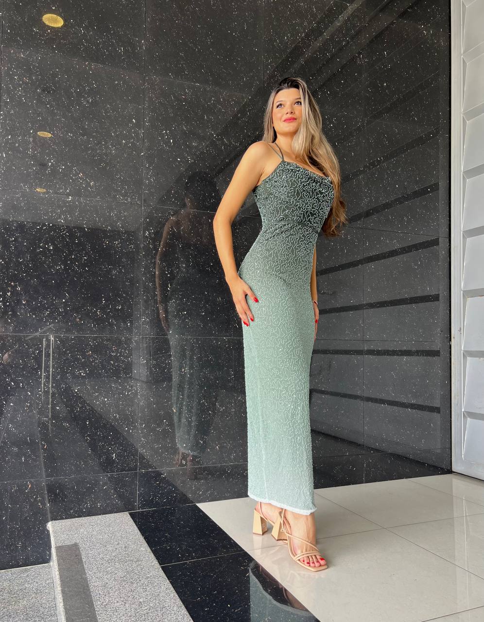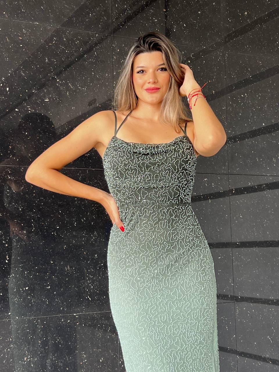 / Maxi vestido con perlas y tiras con degradado
