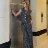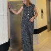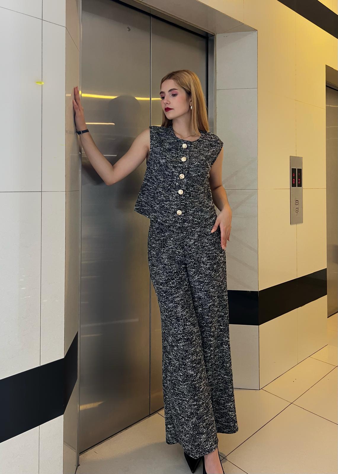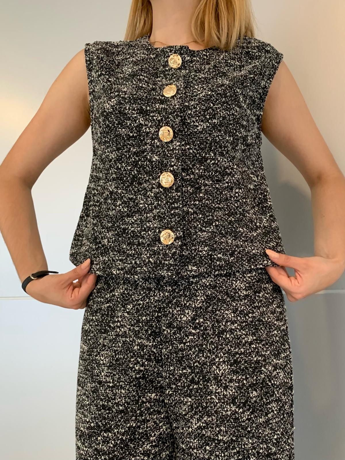 Chaleco y pantalon de lino anchos de cintura alta con botones