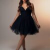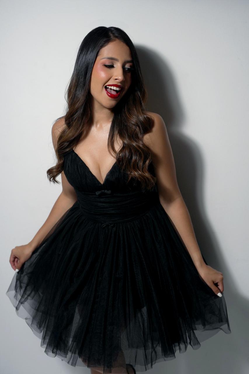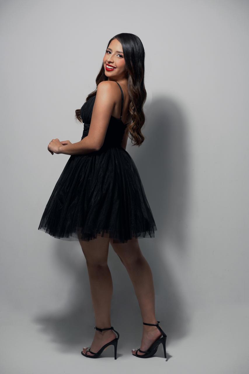 Vestido corto con tirante corte corazon con lazo en el escote y falda de tull cantidad