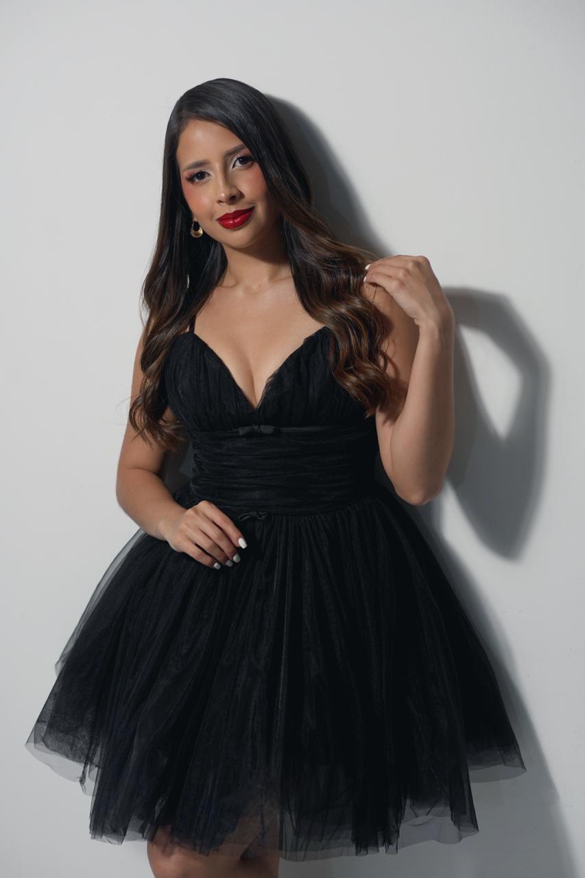 / Vestido corto con tirante corte corazon con lazo en el escote y falda de tull