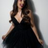 Vestido corto con tirante corte corazon con lazo en el escote y falda de tull