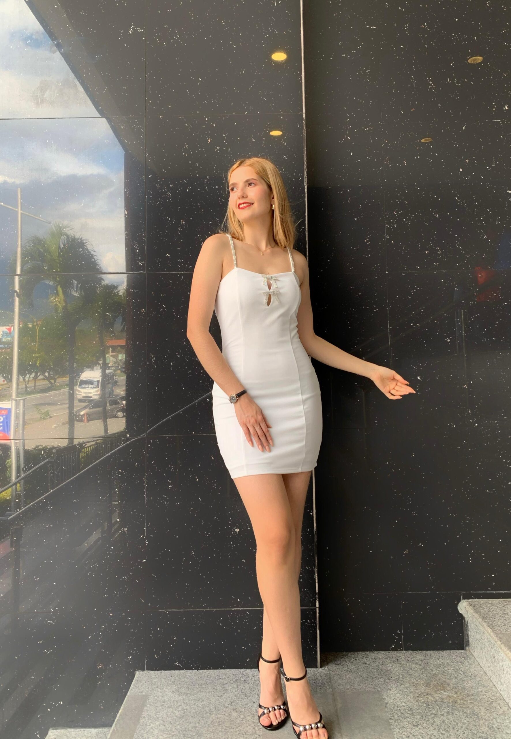 VESTIDO CORTO MINI CON DETALLE DE LAZO DE CRISTAL