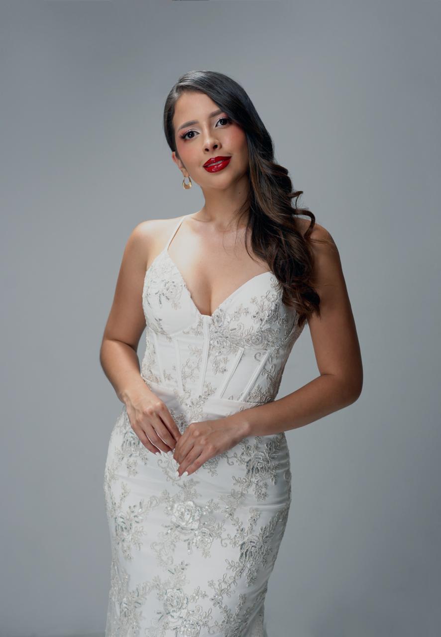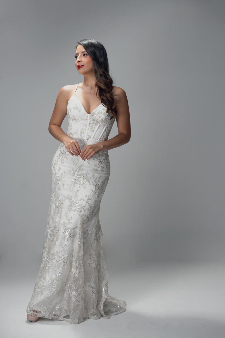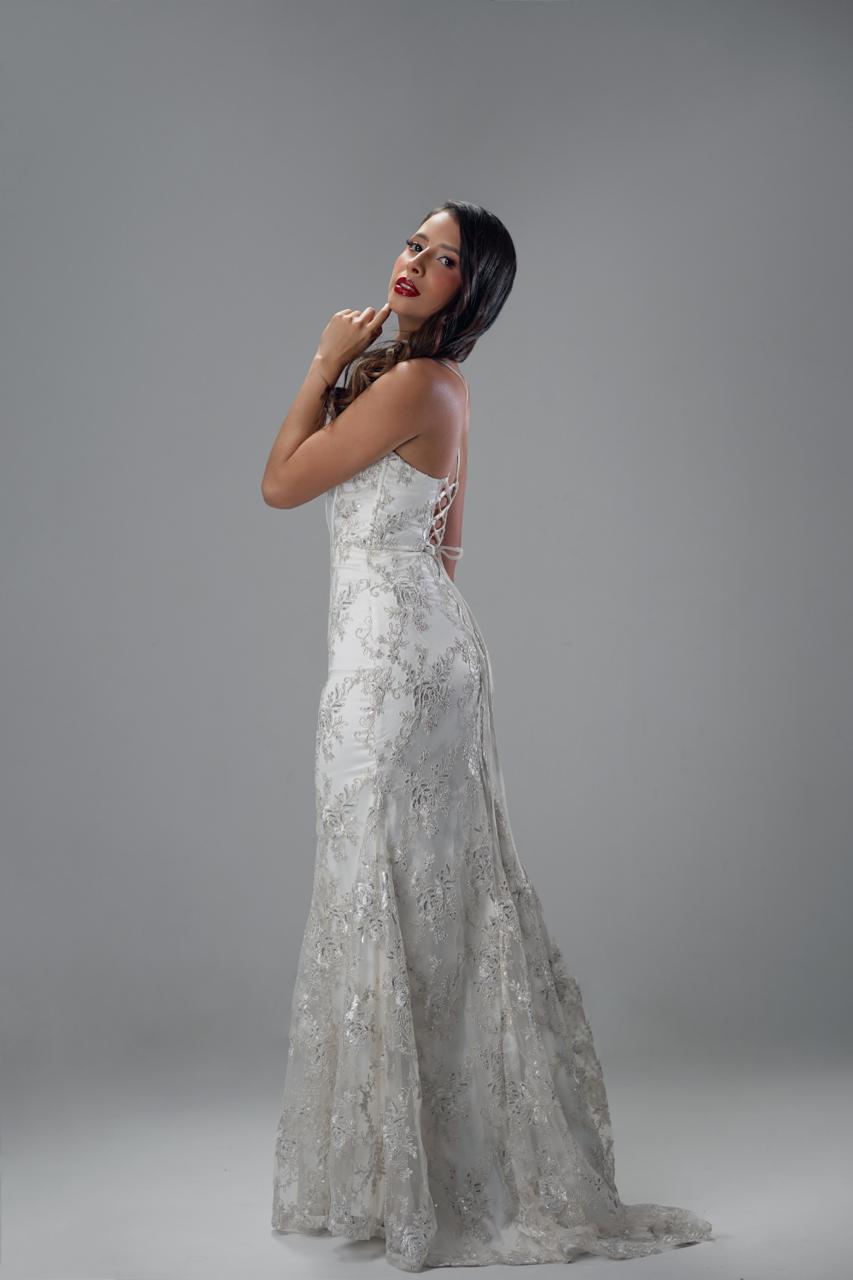Vestido largo con copa bordado de flores en canutillo, amarre en la espalda cantidad